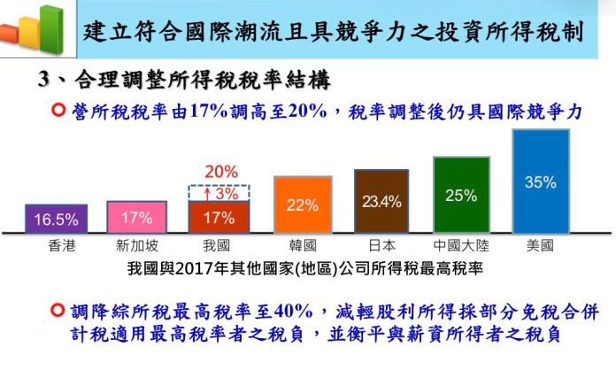 財政部長許虞哲 1 日親自召開記者會,公布稅改方案內容,其中在營所稅部分,許虞哲表示,我國現行營所稅稅率為 17%,與世界主要國家相較偏低,為縮小營所稅與綜所稅的稅率差距,減少公司藉保留盈餘為高所得股東規避稅負誘因,維持股利發放決策中立性,因此,適度提高並配合調降未分配盈餘加徵營所稅稅率5%,該營所稅稅率微幅調整後仍具國際競爭力。
