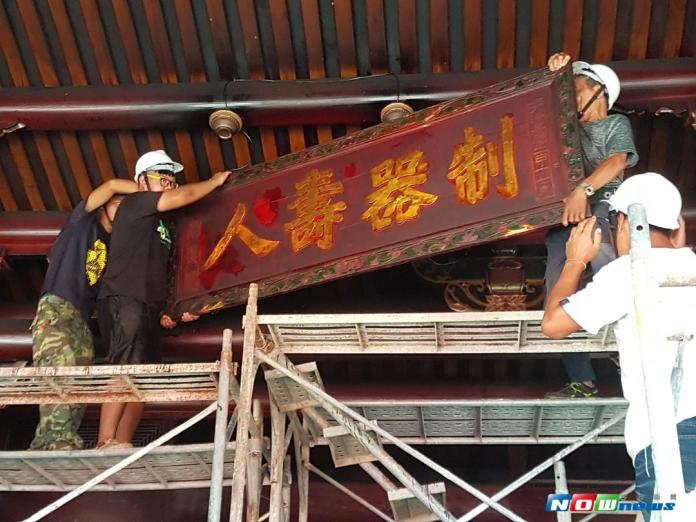 今天上午在廟方與文化局局長李志勇、宜蘭市長江聰淵、縣議員黃定和等地方人士向神農大帝祈求工程順利的祭拜儀式之後,進行鎮殿之寶「制器壽人」(1812年廟宇落成時當時的通判翟淦頒贈)匾額拆卸,正式展開舊廟體解體作業。