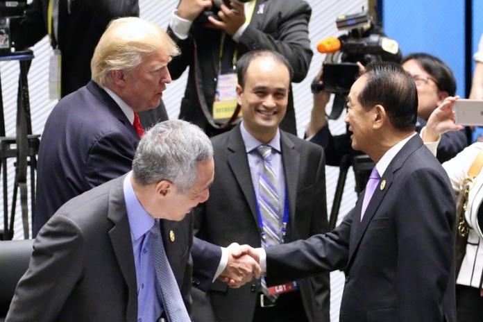 ▲2017年亞太經濟合作會議(APEC)經濟領袖會議11日在越南峴港市登場,台灣APEC領袖代表宋楚瑜(前右)與美國總統川普(Donald Trump)(前左2)握手致意。中央社記者吳翊寧越南峴港攝106年11月11日