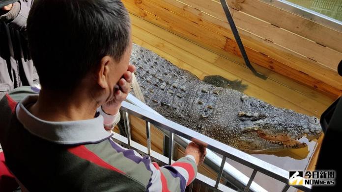 ▲難掩離情依依的邱錫河,對著台灣鱷魚王說再見。(圖/記者陳佩琪攝 , 2017.12.19)