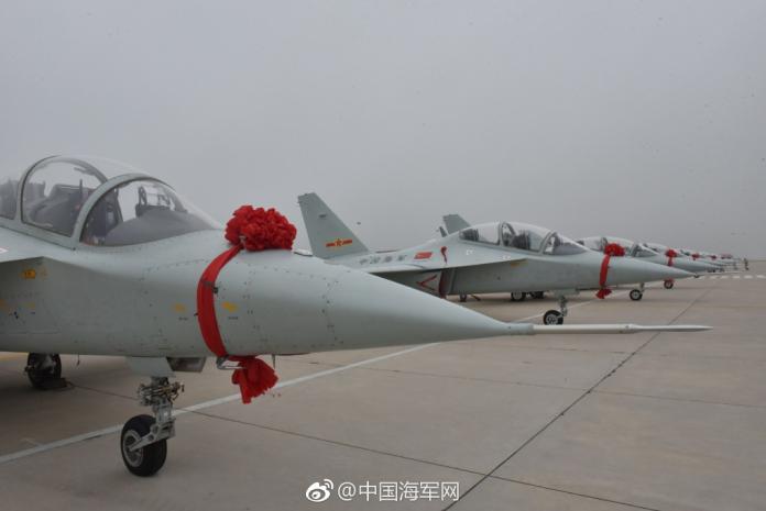 在解放軍海軍官方微博上,一篇《國產某型三代教練機正式列裝海軍航空大學某團》文章介紹,海軍航空大學某團為該機型的列裝,舉行了隆重盛大的儀式,照片中顯示有12架殲教-10,機頭還別上紅綵帶。如此高調公開訊息,相當罕見。