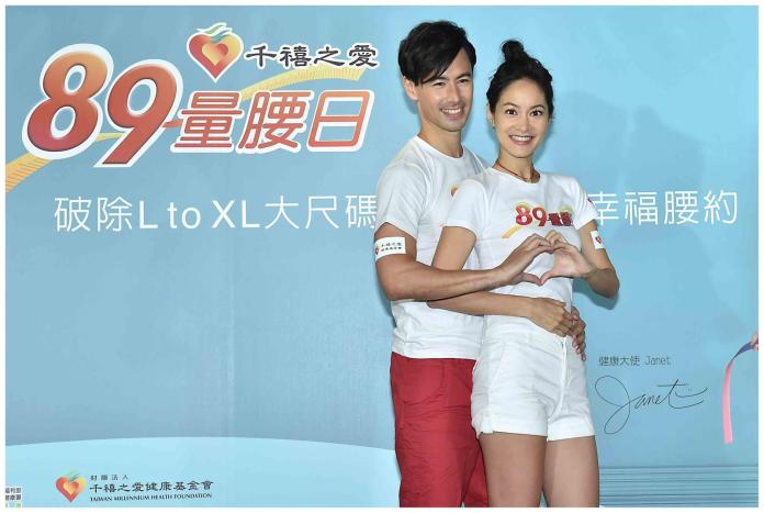 藝人Janet日前於臉書上傳一段和老公George摸腰撫肚的影片,引起粉絲紛紛揣測是否又有喜,爾後才宣布夫妻倆的喜事是擔任2018年千禧之愛「89量腰日」健康大使,要呼籲大家關心自己和另一半腰圍健康。夫妻倆6日出席「89量腰日」活動起跑記者會,Janet表示「因為我們雙方家族都有三高疾病病史,很擔心自己未來也生病,無法陪兒子長大,這次擔任千禧之愛89量腰日健康大使,對我們意義非凡。希望提醒大家『腰圍八九十,健康常維持』的觀念,別讓腰圍跟著年齡一起長大,危害健康。」