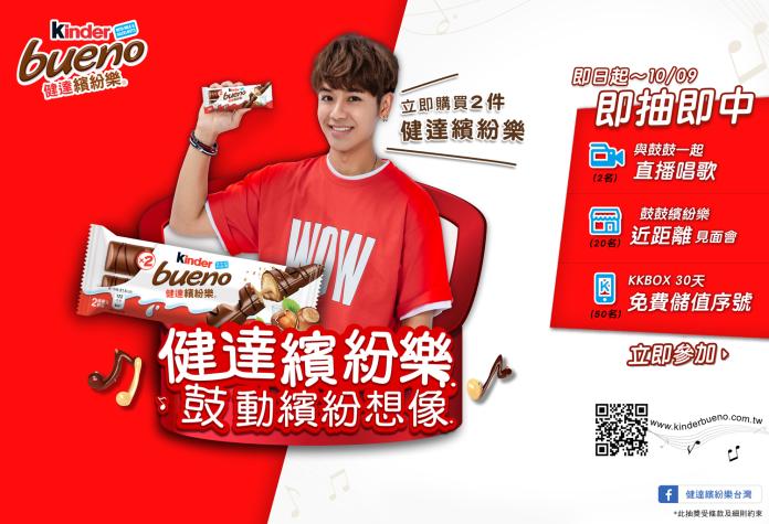 參加活動的粉絲們,將有 2 名幸運兒可獲得首獎 - 【鼓鼓和你唱】,與鼓鼓一起線上直播,合唱健達繽紛樂全新品牌歌曲,零距離地與鼓鼓互動,絕對羨煞所有粉絲。另外,亦有20位幸運兒,能成為【鼓鼓繽紛樂見面會】的VIP嘉賓,由鼓鼓親自分享健達繽紛樂品牌歌曲的創作靈感,還能與鼓鼓合照留念,喜歡鼓鼓的粉絲們千萬別錯過!最後,品牌會再抽出 50 組KKBOX 30天免費儲值序號,讓喜愛健達繽紛樂及音樂的你,盡情享受歌曲,收聽不間斷,好禮有機會即抽即中,讓大家快樂一次擁有,一起繽紛樂每一天!