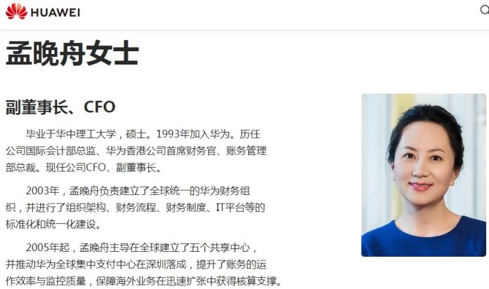 根據華為官網的資訊,孟晚舟畢業於中國華中理工大學,擁有碩士學位,1993年加入華為。歷任公司國際會計部總監、華為香港公司首席財務官、帳務管理部總裁。現任公司CFO、副董事長。近年,為了配合公司的長期發展規劃,孟晚舟致力於華為財經管理的精細化和綜合化,持續建設資金風險管理體系、稅務遵從管理體系,並積極推動財經作業高效、敏捷、智能地開展。