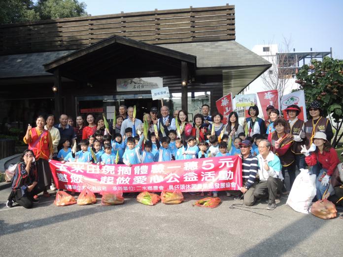 採「玉蜀黍」做公益也邀請二水「小叔叔幼兒園」20多位幼兒到玉米田採玉蜀黍,不少小朋友看到長鬍鬚感到好奇,大家採得不亦樂乎,最後也拿起銅板排隊捐愛心。