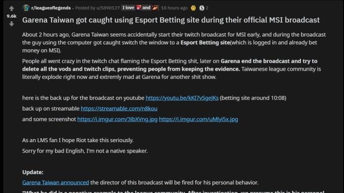 在昨(1)日由《英雄聯盟》遊戲代理商主辦的MSI季中邀請賽中,發生了官方在正式轉播開始前誤啟直播,導致觀眾看到官方人員公然在直播中開啟非法博弈平台網頁,且畫面顯示已經下注;以及在直播試音中說出不雅言語等荒謬情事發生,造成《英雄聯盟》社群輿論沸騰。此事除了在台灣社群內不斷引發討論外,也被網友張貼在Reddit版面上,國外網友對於此事件也感到不可思議,引發了新一輪的討論。