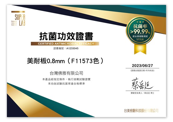 ▲圖說:台美檢驗抗菌功效證書抗菌美耐板的製作過程複雜,首先,需要選擇合適的印刷紙材料,通常是使用各式紋路之印刷紙或素原紙作為基材,接著透過裝飾面紙含浸三聚氰胺樹脂時,將抗菌劑和固化劑添加至含浸槽,將奈米抗菌成分與裝飾面紙充分含浸,最後利用高溫高壓方式,將含浸之裝飾紙結合酚醛牛皮紙壓製成所需的板材。整個製作過程需要嚴格控制溫度、時間和壓力,以確保抗菌成分能牢固地附著在板材表面,並發揮持久的抗菌效果。