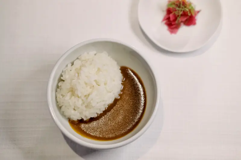 更加強調咖哩中的酸韻,因此加入水梨、蘋果之外,還很特別的加入奇異果,主廚 Nobu也解釋,菜色略帶點酸,味覺能更有驚喜,也能帶出其中的旨味(うまい,umai),熬煮多時的咖哩醬香料辛香、甜韻與酸味都相當平衡契合,配上有「台灣越光米」之稱號的「台南16號米」做出的白米飯,不自覺會一口接一口。Nobu也提到,這個咖哩配方也曾拿來做成咖哩麵包等菜色,但是始終咖哩飯最是美味。