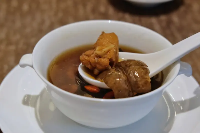 ▲朧粵的廚藝總監簡捷明擁有60年餐飲資歷,他說不僅台灣人會吃鱷魚肉滋補,香港人同樣會吃。(圖/記者葉盛耀攝) 簡師傅也提到鱷魚肉的處理其實麻煩,須先仔細地將鱷魚表層堅硬鱗甲一一去除乾淨,光是第一步就相當耗時費工;而鱷魚本身的風味清甜鮮美,料理時如何拿捏底湯和醬汁的濃淡比例更是極為重要,稍有不慎便會掩蓋鱷魚天然鮮味。像他使用鱷魚腩肉部位,巧妙搭配30年老菜脯做成「三十年老菜脯燉鱷魚」,裡頭還加有雞肉、大骨熬製的底湯,慢燉3~4小時,湯色看似濃郁實,喝起來清雅回甘,毫無雜味。