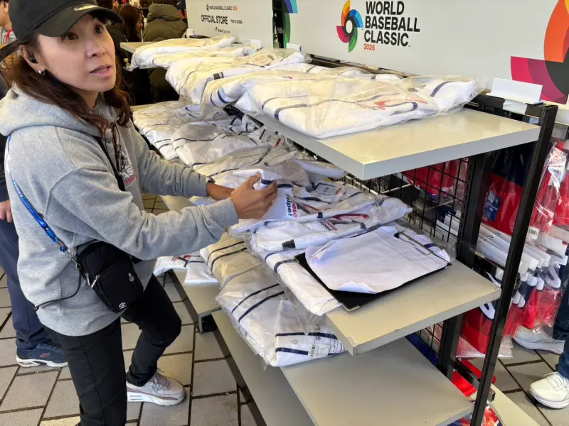 走進官方商店,各國周邊商品琳瑯滿目。從現場直擊畫面可見,印有Chinese Taipei經典標誌的藍、白球衣與應援服,被集中陳列在特定的幾層貨架上。雖然整體佔地不大,但這個小專區卻始終圍繞著滿滿的球迷。大家眼明手快地翻找適合的尺寸,工作人員更是頻頻補貨。