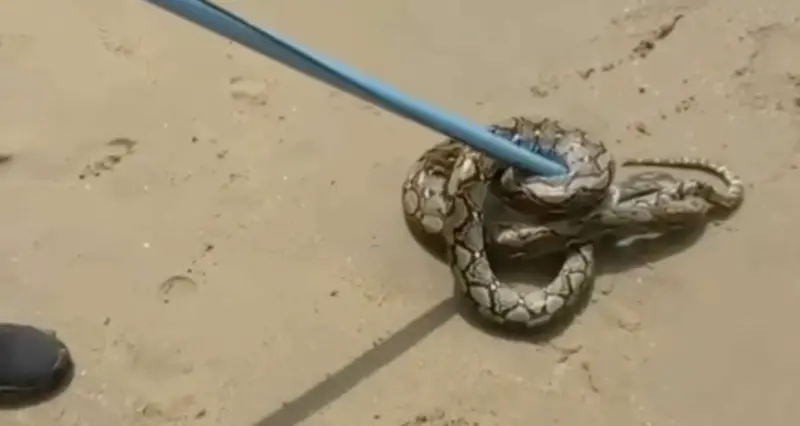 影片顯示,一名救生員使用捕蛇桿將巨蟒控制住,周圍好奇的遊客聚集圍觀。警方及海灘管理人員迅速到場協助,最終將蛇安全帶離沙灘,並釋放到附近的森林區域。