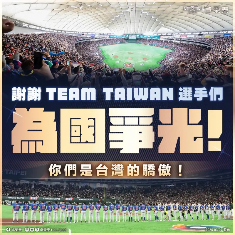 回顧今日戰況,預賽C組的晉級劇本扣人心弦,門票一度在澳、韓兩隊之間來回擺盪,最後由南韓前進邁阿密複賽;反觀中華隊在預賽拚盡全力,因比較失分率後落居下風,連續三屆遺憾無緣晉級。卓榮泰特別感謝所有為國家披上戰袍的選手,認為他們讓全國人民再次團結在一起,甚至展現出把「東京巨蛋變台北大巨蛋」的驚人應援氣勢,讓世界看見來自台灣的團結力量多麼強大。