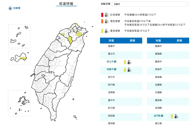 📍黃色燈號:新北市、桃園市、金門縣。