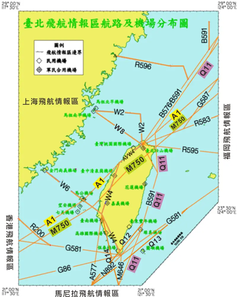 台北飛航情報區航行量最高的航路排名,為東南亞及香港北上經本區前往日本與北美的M750航路居冠,第2名為往來韓國與東南亞間之Q11航路,第3名則為北美與日本南下經本區前往香港或延伸至東南亞之A1航路。