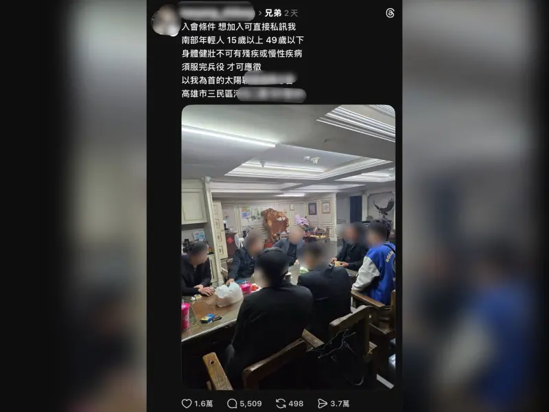 近日網路社群平台Threads上出現一則疑似幫派招募的貼文,並特別標註「兄弟」兩字作為關鍵字,文中明確列出應徵者的入會門檻,必須為「南部年輕人,15歲以上、49歲以下,身體健壯不可有殘疾或慢性疾病,須服完兵役」,並強調若有意願者可透過私訊方式直接進行應徵。