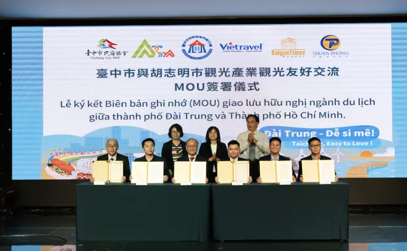 台中市政府觀光旅遊局赴越南胡志明市辦理觀光推廣活動,昨(11)日舉辦觀光推介會成果豐碩,活動吸引當地旅行業者及相關單位近80位出席交流,現場互動熱絡、媒合踴躍,促成台中市旅館商業同業公會、台中市旅行商業同業公會、台中市民宿協會等3大協會與胡志明市3大旅行社Vietravel、Saigon times travel、順捷旅遊等6個單位簽署合作備忘錄(MOU),進一步深化台越觀光交流,為未來送客往來與產品包裝奠定穩固基礎。