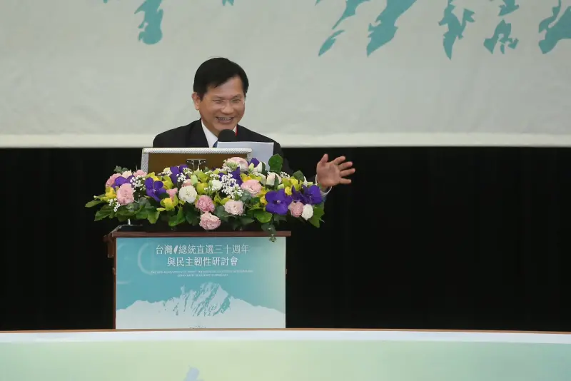 ▲台灣智庫今天舉辦「台灣總統直選三十週年與民主韌性」研討會,林佳龍出席。(圖/記者邱曾其攝,2026.03.14)
