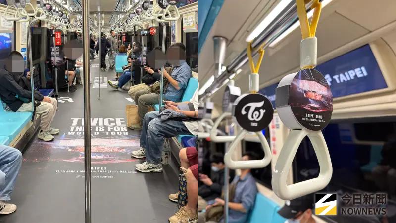 車廂內的完成度也滿有誠意,從一踏進去開始就能感覺到差別,地板直接換成黑底白字的TWICE LOGO,搭配「TWICE THIS IS FOR WORLD TOUR IN TAIPEI」字樣,整個視覺非常滿,車門、玻璃、手把全部都有演唱會主視覺,連抬頭天花板都有圖片,不管是左看右看上看下看,真的每個細節都不簡單,隨便一個角落都可以拍。
