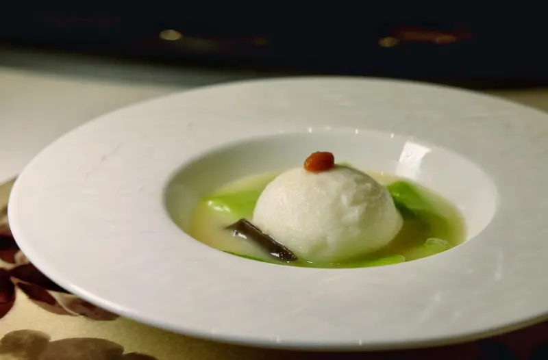 李雲浩的「龍騰四海」更是將龍蝦做出兩種吃法:以精熬龍蝦湯蒸製鮮活龍蝦肉與蛋白,彈牙的大塊龍蝦球在蝦湯與蛋白的襯托下鮮味更足;另一吃則是將龍蝦肉切丁,搭配爽脆的蔬菜丁快炒,盛於精巧的舟形小盞之上。
