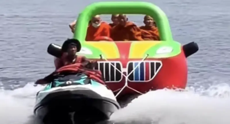 泰國武里南府一段僧侶搭乘香蕉船的影片這兩天在社群平台瘋傳,畫面裡5名僧侶坐上造型像汽車的水上拖曳設施,在汶孔隆水庫高速滑行,引發外界兩極反應。有人覺得畫面荒唐又好笑,也有人質疑,僧侶身分象徵莊重與克制,公開參與娛樂性質濃厚的水上活動,恐怕已踩到社會對宗教形象的敏感紅線。