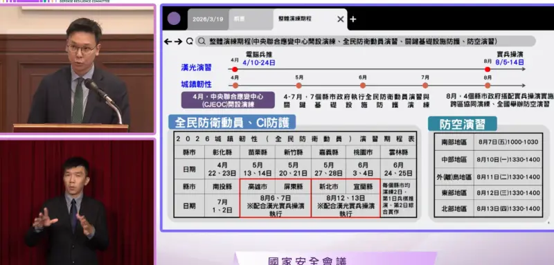 總統府今(19)日召開「全社會防衛韌性委員會」會議,國安會副祕林飛帆於會中報告,此次城鎮韌性演習有4大重點,同時並公布演習時程,漢光演習電腦兵推從4月10日至24日,8月5日至14日則是實兵操演,城鎮韌性演習則從4月一路到8月,4月會搭配漢光電腦兵推,進行中央聯合應變中心(CJEOC)開設演練;此外,演習天數從一天擴增成兩天,一天兵推、一天實作操演。