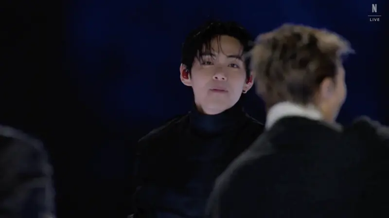 ▲BTS防彈少年團今晚在光化門舉辦免費演唱會,成員V(金泰亨,如圖)致詞時把「最後一首歌」說成「最後一場演出」,嚇壞台上成員。(圖/X@NetflixKR)