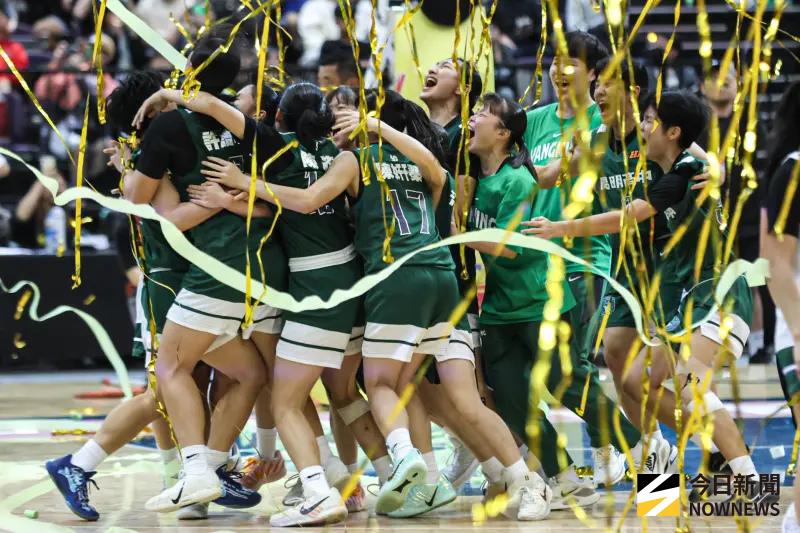 ▲蘇衡上籃打進致命2分,最後32秒領先到8分,也鎖定最後勝利,現場拋下綠色彩帶。(圖/記者朱永強攝)