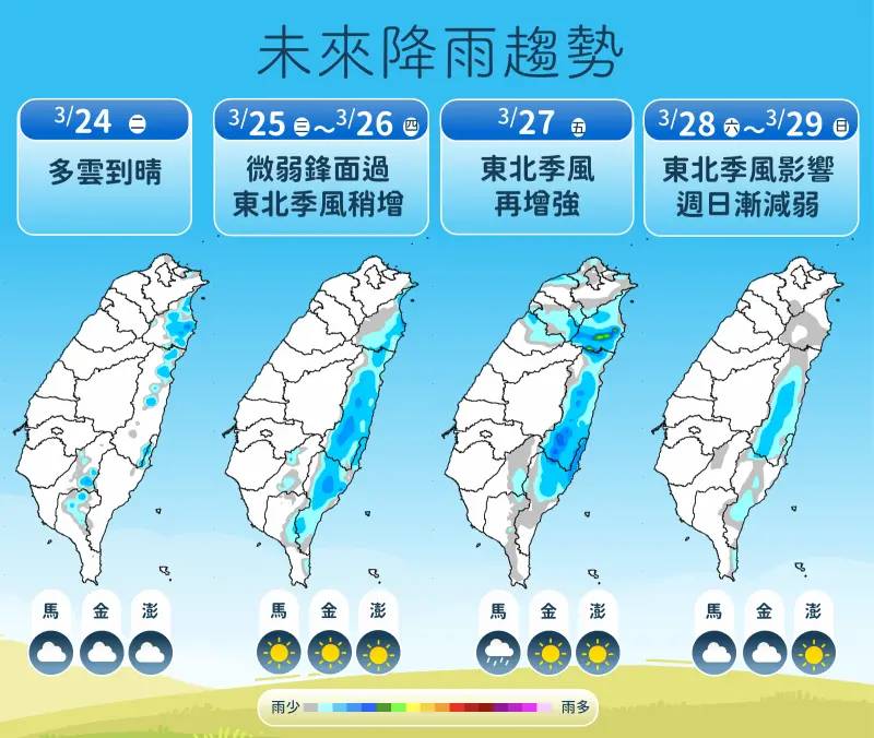周五(3月27日),第2波東北季風將再度增強。黃恩鴻分析,周五的水氣量相對較多,降雨範圍涵蓋北部、東半部及恆春地區,氣溫持續偏低,北部、宜花高溫24至25度,低溫17至19度。周末(3月28日至3月29日)水氣稍減,但大台北山區與東半部仍有局部短暫陣雨,民眾周末出門建議攜帶雨具。