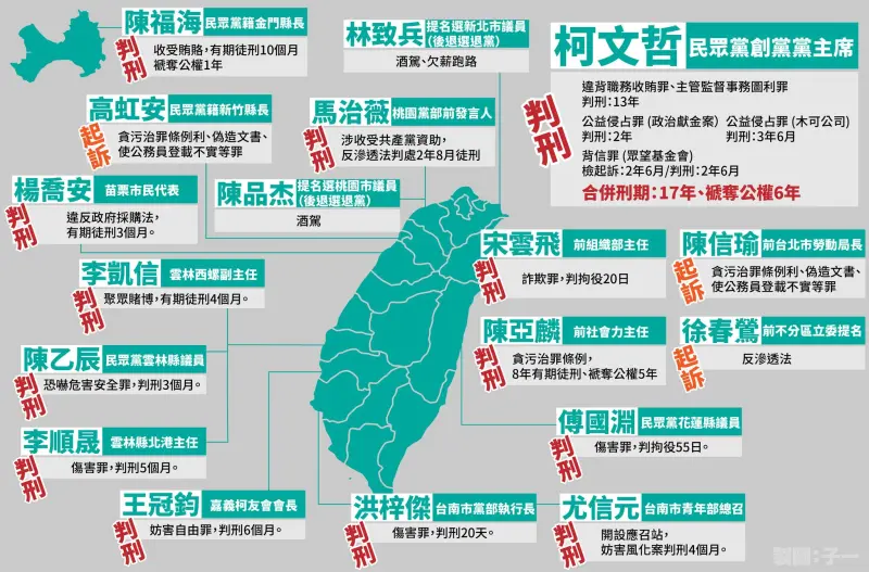 前民眾黨主席柯文哲因京華城等案於昨(26)日遭宣判一審17年有期徒刑、褫奪公權6年,引起社會高度關注。對此,民進黨新聞部副主任黃子一統整了全台各地有被判刑的民眾黨人,更加入有酒駕的和已起訴的,共18名,其中包括柯文哲、新竹市長高虹安、原要被提名不分區立委的中配徐春鶯等,黃子一更奉勸大家「政治不難,找回良心而已」。