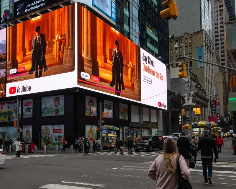 周杰倫巨幕電子看板在各大城市登場,包括Spotify在紐約時代廣場Time Square 25層樓高的巨型螢幕,YouTube Music的看板也在紐約時代廣場不遠處的百老匯大道上,同時在洛杉磯落日大道、香港海港城也出現YouTube Music的看板,騰訊旗下的QQ、酷狗的看板也在紐約時代廣場露出,台北也有三個大看板在信義區,今天總計有16個巨型看板在台北、紐約、洛杉磯、香港、三亞、武漢、西安、天津、無錫登場,騰訊將陸續共有48個看板出現各大城市。