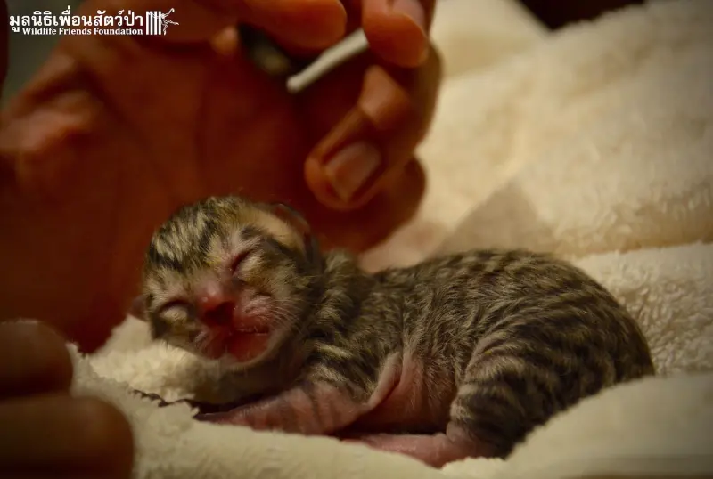 泰國中部佛丕府的泰國野生動物友好基金會(Wildlife Friends Foundation Thailand)在2016年分享一則野生動物通報特殊案例,當地有民眾在路邊發現一隻垂死命危的野生幼貓,花色似一般常見的虎斑貓,民眾緊急通報救助協會,希望能讓小生命重拾健康生活與身體。