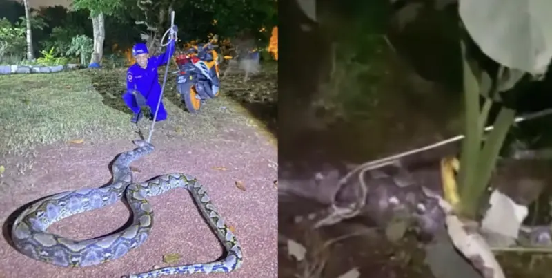 民防部隊接獲通報後迅速趕抵,並動用專業器材進行圍捕。不過過程並不輕鬆,巨蟒疑似受到驚嚇,一度試圖掙脫,甚至將已吞入口中的牛隻吐出,現場氣氛相當緊繃。經過約30分鐘的處置,執法人員最終成功控制並捕獲這條巨蟒,也暫時排除對附近居民的威脅。
