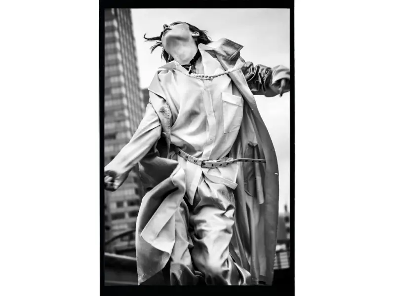 「最簡單的構圖,最強大的敘述。」在 Vadukul 的鏡頭下,黑色的布料不再僅是遮蔽物,而是刺破平庸都市景象的利刃。不對稱的剪裁與東京粗獷的街道紋理相互呼應,展現出「光影越紛擾,黑白越顯純粹」的極致視覺張力。