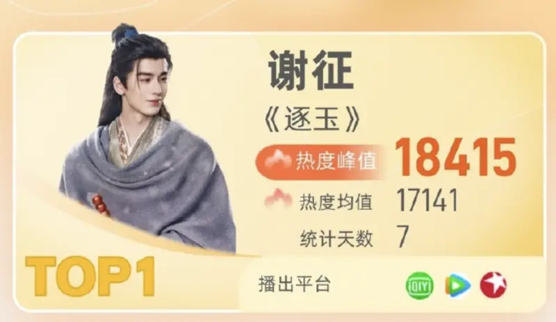 根據酷雲數據統計,張凌赫在《逐玉》中飾演的「謝征」在2026年3月23日開始,一直到4月5日都是角色熱度週榜冠軍,貓眼數據也同步應證,微博稱他為多平台統治級熱度,魅力不容小覷。