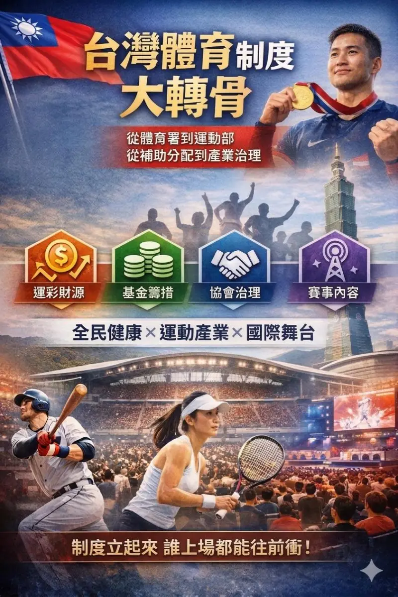 何昱奇說,運動部正式揭牌,並採取「1部、1署、3中心」架構,將全民運動、競技運動、產業、國際事務、設施、適應運動等功能整合為更高層級的治理體系,已代表台灣體育不再只是教育附屬業務,而被提升為中央二級機關直接治理的國家戰略事項。只是,組織升格僅是開端,若要避免升格淪為政治象徵,台灣必須從預算邏輯、財源結構及治理模式進行全方位的「制度升級」