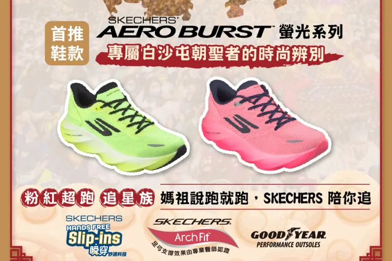 值得一提的是,針對挑戰9天8夜全程隨行的「神人級」信徒,以及追求潮流的年輕世代,SKECHERS特別推出AERO BURST鞋款。該鞋款不僅以亮眼螢光配色呼應白沙屯媽祖「粉紅超跑」的意象,更延續了高階跑鞋科技。
