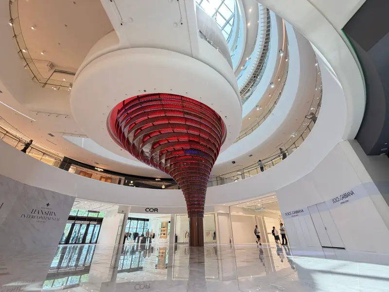 光嶼中庭:廣場中央規劃了挑空採光天井,光線可自上而下灑落,並結合聲光裝置呈現全新的城市購物體驗。
