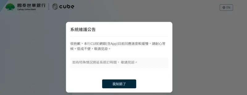 目前要登入國泰世華銀網路銀行,就會跳出公告「很抱歉,本行CUBE網銀(含App)目前回應速度較緩慢,請耐心等候,造成不便,敬請見諒。」