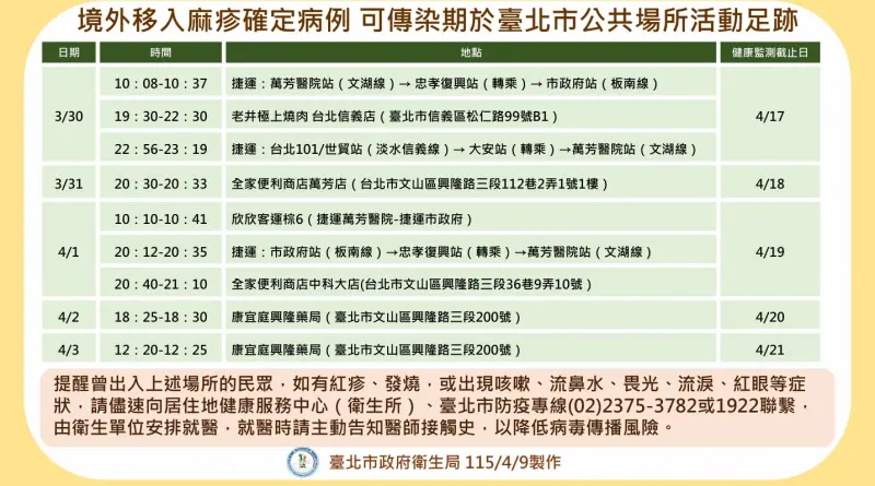 台北市衛生局今(10)日下午公布新增1例麻疹境外移入確定病例,為30多歲本國籍男性,於4月1日出現疲憊與結膜炎症狀,於4月8日疾病管制署研判為確定病例。針對個案匡列接觸者383人,健康監測至4月21日;也因為個案於可傳染期間有公共場所活動史,包括曾搭台北捷運板南線、淡水信義線,也曾前往老井極上燒肉台北信義店用餐,請足跡重疊民眾自主健康監測至4月21日。