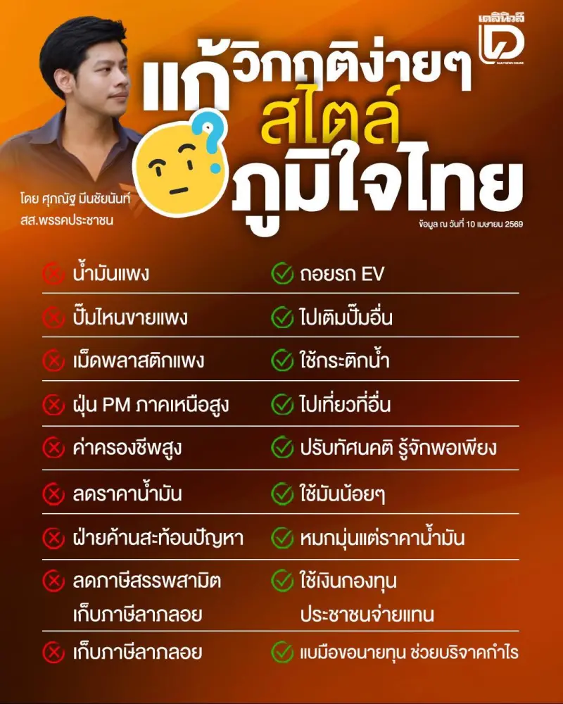 臉書粉絲專頁「泰爸噗嚨共 ThaiBa ไทยป๊า」近日轉發一張由泰國反對黨人民黨(พรรคประชาชน)國會議員ศุกนัฐ มีนชัยนันท์製作的懶人包圖卡,標題直白:「泰自豪的簡單治國法」,以左右對照方式排列一個個甩不掉的民生難題與執政黨的對應「解法」,在泰國網路上迅速擴散,引發大批網友共鳴。