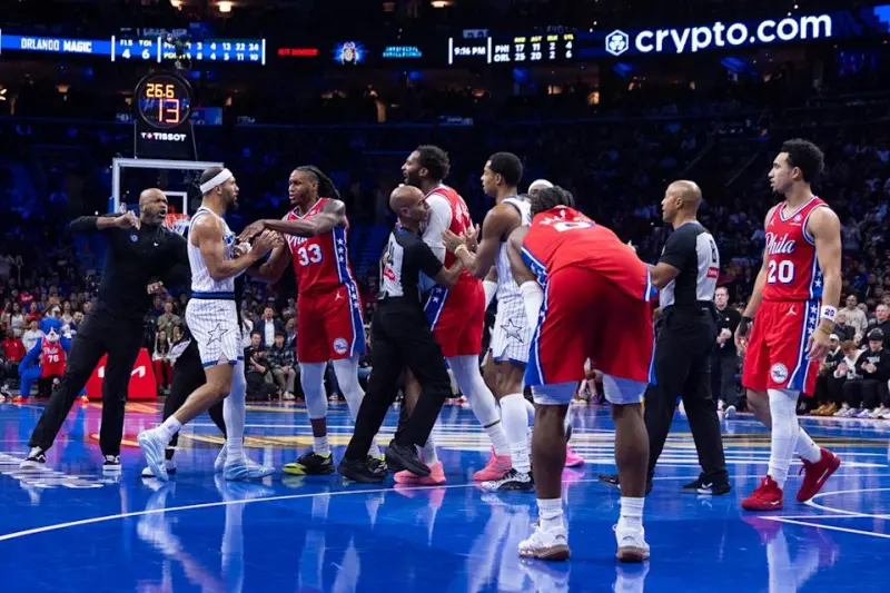 此時魔術後衛薩格斯(Jalen Suggs)展現「挺兄弟」悍將性格,從畫面外衝入狠推體重約 127 公斤的卓蒙德,導致衝突升級,包括魔術貝恩(Desmond Bane)與 76 人沃克(Jabari Walker)全捲入大亂鬥。最終薩格斯連吃兩次技術犯規,立即遭驅逐出場,卓蒙德等人也領一次技術犯規收場。薩格斯賽後更直言,「不後悔,永遠力挺兄弟!」