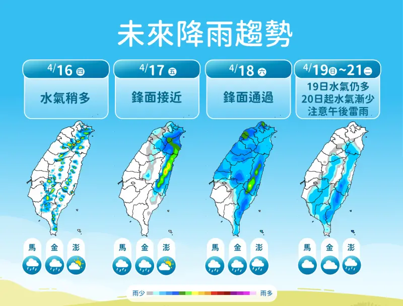 中央氣象署預報員鄭傑仁表示,今(15)日微弱鋒面通過,桃園以北、宜蘭有局部短暫雨,晚間基隆北海岸有較大雨勢,明(16)日水氣仍多,周五(4月17日)再有鋒面接近,周末(4月18日至4月19日)受東北季風影響,北台灣轉涼且降雨增多,下周一、二(4月20日至4月21日)才逐漸回溫。