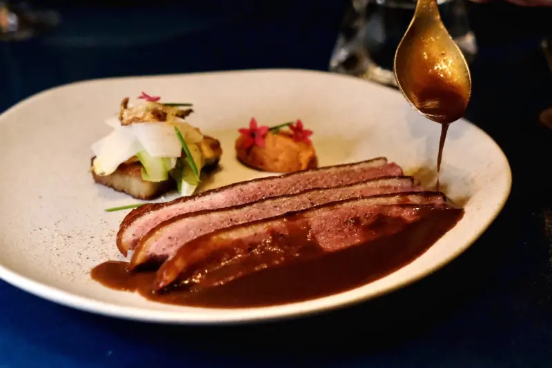台南晶英酒店「盧昂血鴨」四人套餐共有六道佳餚,幾乎都完整扣著「鴨」此元素,像是開胃小點有「鴨肝棒棒糖」,還有「手作法式肉派」,皮蒂維耶酥皮餅(Pithivier)包有鴨胸慕斯與豬絞肉,酥鬆又噴香,搭佐巴薩米克醋、蘋果醬與茴香蘋果辣根美乃滋沙拉。再有「澄清鴨肝湯佐松露餃」,以鴨骨、蔬菜及鴨翅熬製澄清湯底,搭佐松露湯餃、現刨新鮮松露,看似清澈卻鮮醇無比。