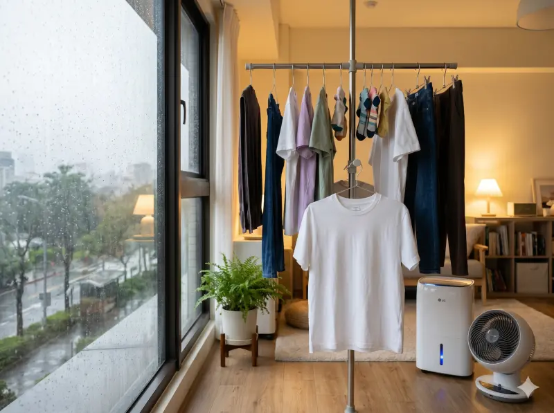 - 晾衣除濕機加風扇輔助:若遇雨天需室內晾衣,應關門窗並開啟除濕機,同時搭配電風扇或循環扇輔助,加速乾衣效率。