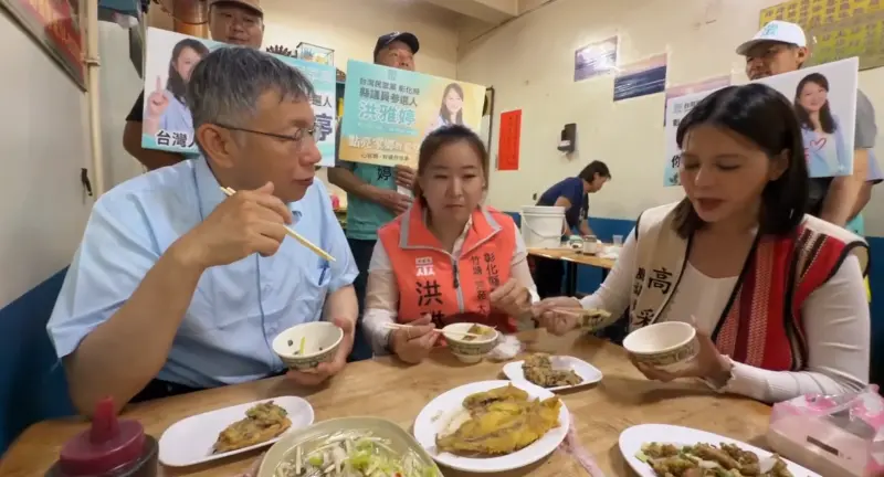 ▲柯文哲在福興大啖彰化知名小吃爌肉飯。(圖/民眾黨彰化縣黨部提供,2026.04.18) 柯文哲今(18)日的鐵人行程從上午7點展開,17小時內要到9個鄉鎮市為13位黨提名的議員、鄉鎮市民代表參選人拉抬聲勢,幾乎每到一個地方,當地人便準備知名小吃招待,讓他的輔選行程變成美食之旅。晚上他主持候選人培訓課程,黨工們還打算帶他到縣黨部附近知名的林家素食吃宵夜。