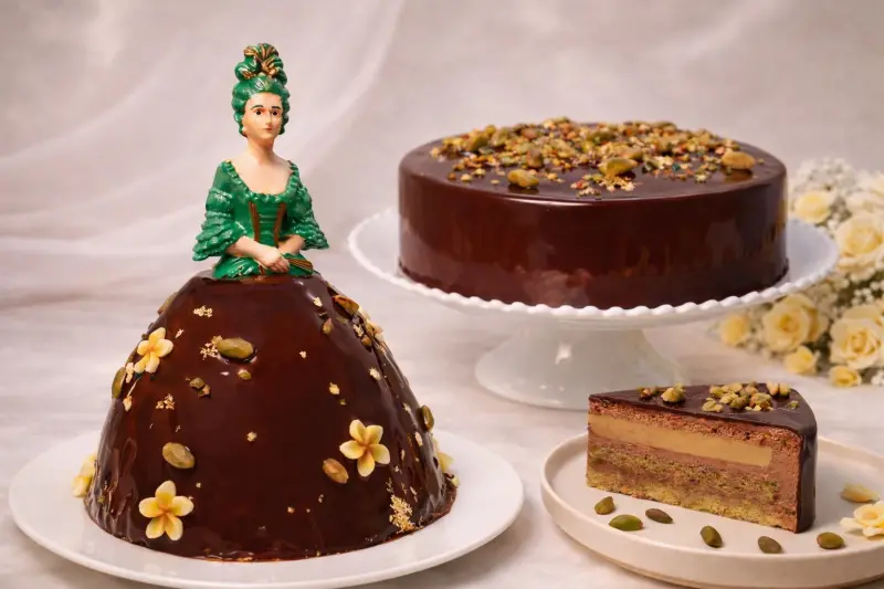 台北晶華酒店的「3D立體Marquise侯爵夫人蛋糕」每年都以優雅外型受到矚目,因為以法國路易王朝第一美女龐畢度侯爵夫人(Marquise de Pompadour)為靈感做出造型,展現長、寬17公分、高23公分的立體結構蛋糕。今年「夫人」的裙襬,更是以開心果海綿蛋糕為基底,結合杜拜巧克力內餡與開心果奶油慕斯,外層還包覆光澤細緻的巧克力淋面,。每個售價2980元。另還有同樣以奢華的杜拜巧克力主角的