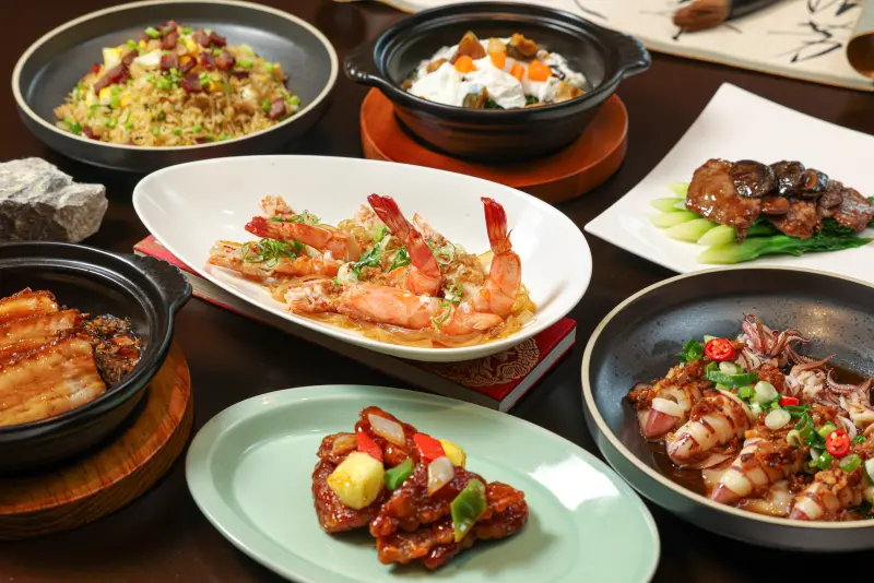 像是前菜選項就有招牌的蜜汁叉燒、玫瑰油雞、黃金炸魚皮、花生炆雞腳及青瓜海蜇絲。煲湯類則有選用老母雞與豬骨等食材慢燉而成的足料老火靚湯,以及瑤柱花膠銀耳羹等選擇。港式點心更是準備了晶瑩鮮蝦餃、北菇蒸燒賣、金珠鹹水餃、蜂巢炸芋角、古法糯米雞、醬皇金錢肚、江南素菜餃、XO醬蘿蔔糕等。