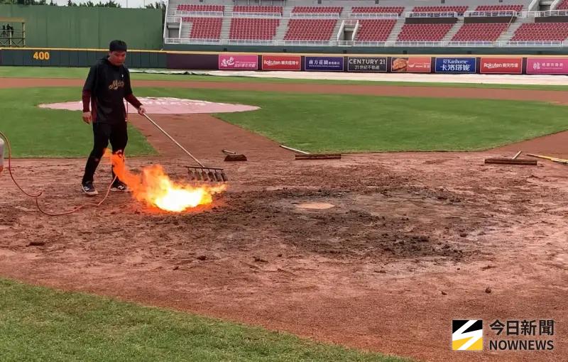 中華職棒樂天桃猿今(25)日持續在大本營桃園球場迎戰味全龍,昨(24)日受到雨勢影響延賽,今晨雨勢減緩,雖然未出現陽光,但也沒再降雨,有機會如期開賽。有趣的是,球場場務人員出動噴槍,重現經典「火烤本壘」方式,加速本壘板附近紅土的水分揮發。