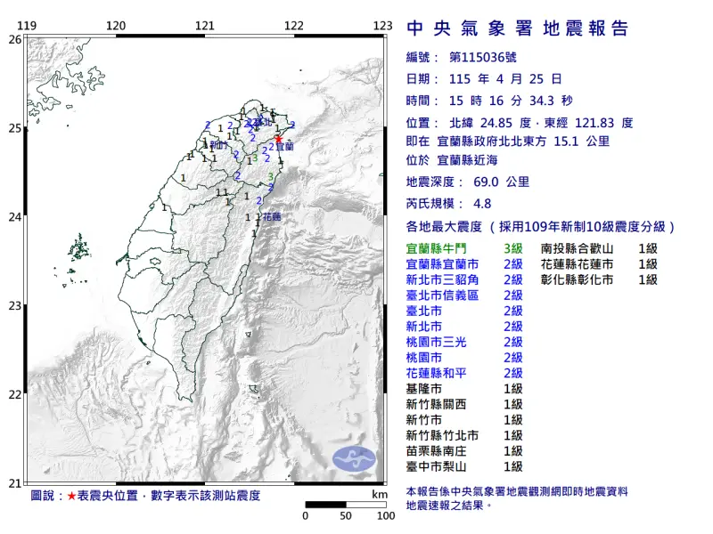 中央氣象署發布地震速報表示,今(25)日午後地牛翻身,下午15時16分宜蘭發生芮氏規模4.8地震,震央即在宜蘭縣政府北北東方 15.1 公里 ,位於宜蘭縣近海 ,地震深度69公里,最大震度3級,出現在宜蘭縣。另外,北北基桃也有感晃一下。