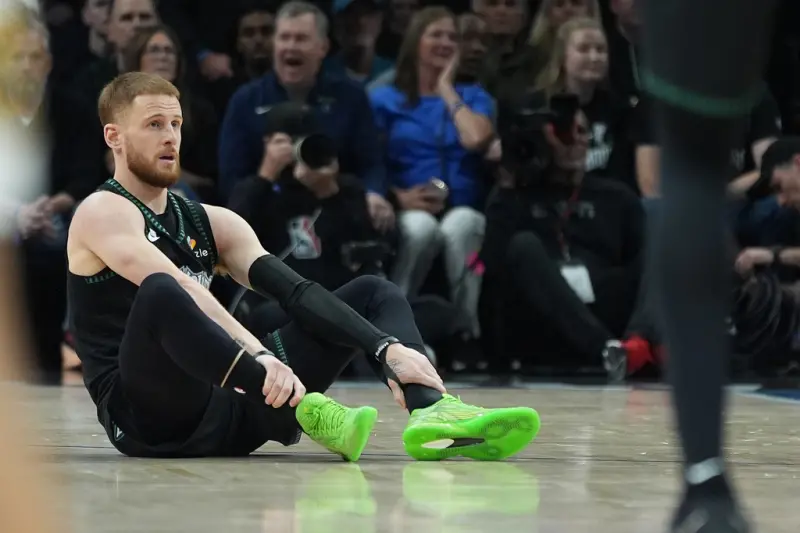 ▲迪文琴佐在一次跑動中無預警倒下,隨即捂住腳踝後側。現場轉播畫面隨後釋出慢動作回放,清晰捕捉到迪文琴佐受傷瞬間,其右小腿肌肉後側出現了不自然的震顫與回彈。(圖/美聯社/達志影像) 傷情聯想杜蘭特與塔圖姆 灰狼戰力大折損